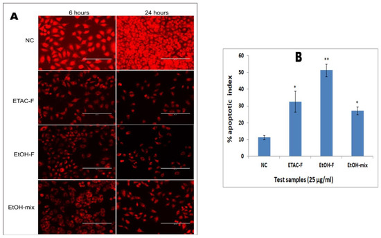 (A) The photo-micrographs call attention to the capability of the extracts to interrupt the potential of the mitochondrial membrane. (B) Graphical illustration of percentage apoptotic indices. The apoptotic index for every test group was expressed as the percentage of the ratio of the unstained cell no./overall cell no. in 10 different fields. NC (7.2 ± 0.8%) = negative control; ETAC-F (49.4 ± 2.7%) = ethyl-acetate extract of flower; EtOH-F (56.2 ± 4.8%) = ethanol extract of flower; EtOH-mix (36.9 ± 3.6%) = ethanol extract of mixture. Values presented as percentage mean ± standard deviation (n = 6), ** represents p < 0.01 and * represents p < 0.05.