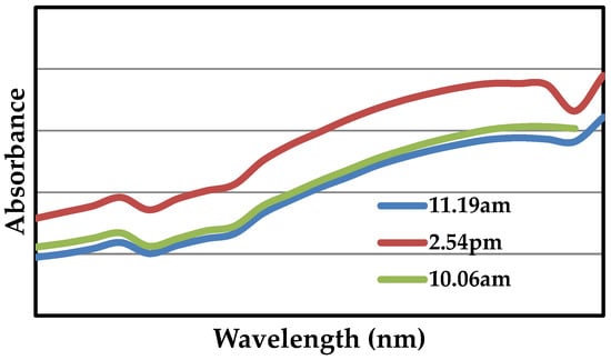 As shown in Figure 1, ZnO NPs prepared with mango seeds powder were recorded using UV-Visible spectroscopy. UV-Visible spectra measurements were carried out at various time intervals of 4, 12 and 24 h. The absorbance of ZnO NPs rose gradually over 23 h, as evidenced by a linear relationship between the first value and subsequent readings performed at 1 h 13 min, 3 h 35 min and 19 h 12 min. The formation of ZnO NPs was confirmed by the observation of maximal absorbance at 480 nm, which is the typical wavelength for this formation. The observed UV spectrum around 450 nm indicates that in the reduction process, the semiconducting property of ZnO has not been lost [46].
