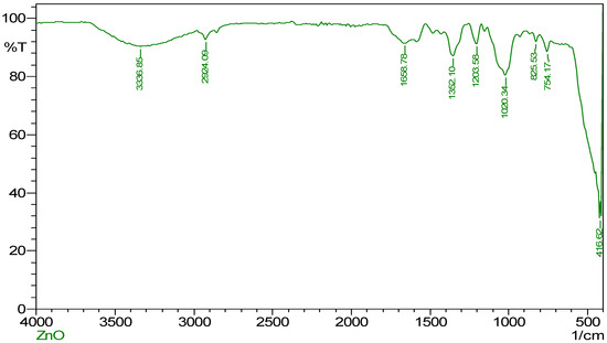 Characterization and an explanation of the functional groups involved in the synthesis, reduction, and stabilization of ZnO NPs were accomplished with the assistance of FT-IR spectroscopy. As shown in Figure 2, ZnO NPs may be mediated by extracts from mango seeds. Specifically, a prominent peak was detected at 3336.85 cm−1, analogous to the stretching vibration of −OH and –NH2 groups. These functional groups could be produced from the water and mango seed extract [8]. Further, another broad peak was observed at 2924.09 cm−1, corresponding to the carboxylic group’s O-H stretch. This peak can be seen in the spectrum. The peak at 1658.78 cm−1, which coincides with the C = O stretch that the ketone group has. The N = O bend of nitro groups is related to a peak located at 1352.10 cm−1, and peaks at 1203.58 cm−1 and 1020.34 cm−1, are associated with the C-O stretch of ester and ether groups, respectively. The peaks associated with aromatic groups are located at 825.53 cm−1, 754.17 cm−1, and 416.62 cm−1. Although numerous studies have reported using plant extracts for metal nanoparticle synthesis, the mechanism of bio-reduction is still elusive. On the other hand, the phytochemicals that are present in the plant source are the ones that are thought to be responsible for the nanoparticles’ reduction and stabilization [14,46]. In agreement, we speculate in the present study that the phytochemicals, such as polyphenols, flavonoids, and carotenes found in the seed extract, might be deeply involved in the bio-reduction of the nanoparticles [42,43].