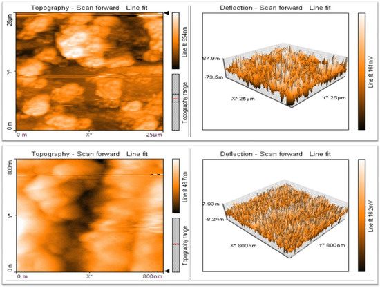 In Figure 6, the 3D images obtained by the AFM are reported. The outcome provided 2D and 3D imaging of biosynthesized ZnO NPs, revealing their average size to be 55 nm and their spherical form (Figure 6).