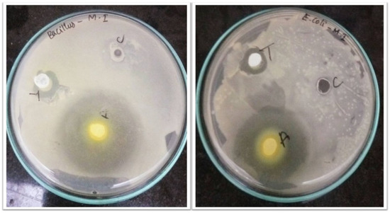 The antibacterial activity of ZnO NPs that had been aided by mango seed extract against Bacillus subtilis and E. coli was studied (Figure 7). Previous research indicated that ZnO NPs demonstrated strong antibacterial action against a wide variety of microorganisms [14,45,46,47]. In agreement, the present study results also exhibited a significant inhibitory effect against the tested pathogens, compared with standard antibiotics. Earlier studies have also shown the ZnO NPs bactericidal activity, indicating that the nanoparticle can completely kill the bacteria [48]. Nevertheless, our study showed that ZnO NPs prepared from mango seed extract possess bacteriostatic properties. Both the tested organisms exhibited a minimum inhibitory concentration (MIC) at 10 μL. The inhibitory effect is indirectly proportional to the size of the nanoparticle. The smaller size of the nanoparticles the greater will be the inhibitory effect [49].