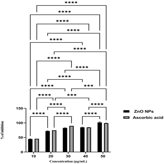 Antioxidant activity of ZnO NPs (ascorbic acid as a standard). Asterisks show a statistically significant difference (****—p ˂ 0.0001, ***—p ˂ 0.001).