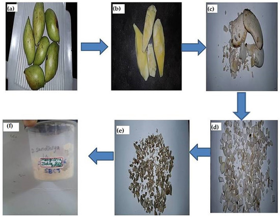 Preparation of mango seed extract. (a) Collection of raw mangoes (b) Collection of raw mango’s seed part (c) Mango seed part was cut into small pieces (d) Shade dried (e) Collection of shade dried mango’s seed part (f) Grounded to obtain coarsely powdered form.