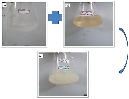 M. indica seed extract-based ZnO NP synthesis. (a) 10 mM Zinc nitrate precursor solution (b) M. indica seed extract (c) M. indica seed extract combined with Zinc nitrate precursor solution.