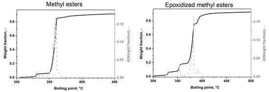 The simulated distillation method allows the separation of high boiling-temperature chemical substances based on their boiling point [27]. The result of this analysis is the dependence of the weight fraction on the boiling point for the methyl ester (ME) and epoxide methyl ester (E_ME) (Figure 1).