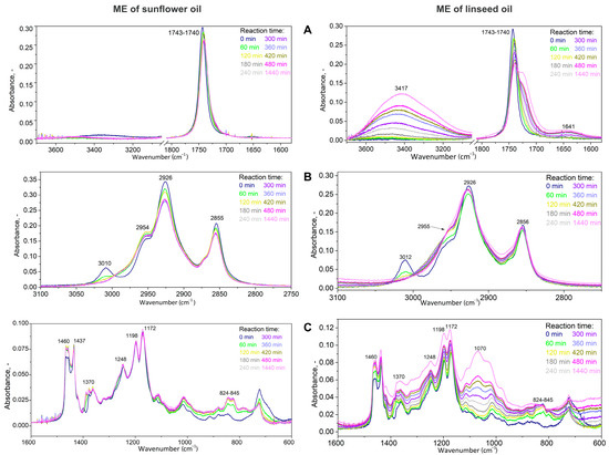 The infrared spectra of the reaction mixture during epoxidation for ME of sunflower and linseed oil. (A)—wavenumber range of 3700–1600 cm−1, (B)—wavenumber range of 3100–2750 cm−1, (C)—wavenumber range of 1600–600 cm−1.
