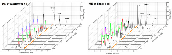The HPLC chromatogram of reaction mixture during the epoxidation for ME of sunflower and linseed oil (orange line separates ME with and without oxirane rings).