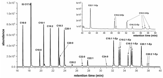 The methyl esters with oxirane rings were eluted in the retention time of 5.0–11.4 min. The methyl esters without oxirane ring were eluted later (retention time 11.5–25.0 min) and were clearly identified by standards. Their retention time increased with increasing Equivalent Carbon Number (ECN) of the ester molecule in the following order: ME of linolenic acid, linoleic acid, oleic acid and palmitic acid. Note: ECN is calculated as the number of carbons in the chain minus two times the number of double bonds [34]. However, the ME with oxirane rings were not clearly separated, especially for linseed oil, where more intermediates were formed.