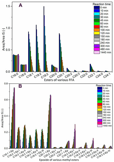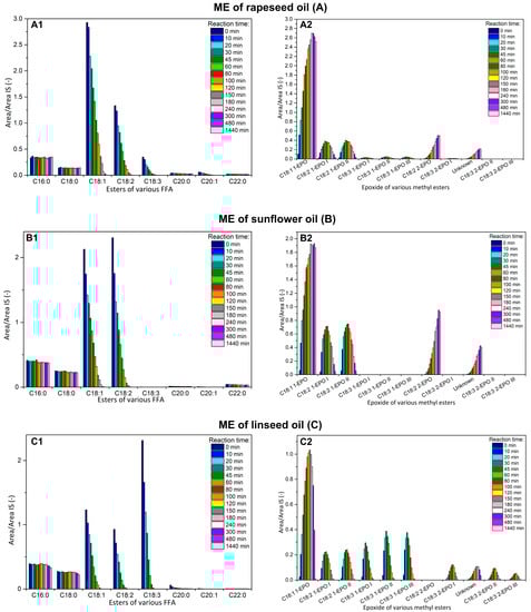 All methyl esters without an oxirane ring were clearly identified and their retention times are in Table S1 in Supplementary Materials. The content of saturated ME was approximately constant in the reaction time, while the decrease of unsaturated ME during the reaction time was observed, which was expected (Figure 5(A1–C1)). The methyl esters with oxirane ring(s) are assigned according to the number of atoms in the carbon chain and the number of double bonds before epoxidation; then, the number of the epoxide group and the last roman numbering indicate the variant of epoxides (different position of oxirane group or cis/trans), i.e., C18:3 2-Ep I is epoxide from ester of linolenic acid (C18:3) with two oxirane group (2-Ep) and some cis/trans combination (I).