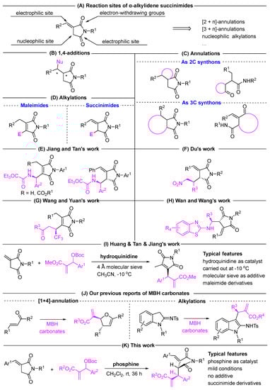 Notably, Morita–Baylis–Hillman (MBH) carbonates were successfully employed as versatile allylic alkylation reagents to undergo asymmetric allylic substitutions with a wide range of nucleophiles with the aid of a chiral nucleophilic catalyst [23]. In 2012, Huang, Tan, and Jiang et al. reported a hydroquinidine-catalyzed allylic alkylation of Morita–Baylis–Hillman (MBH) carbonates with N-itaconimides as nucleophiles to afford a variety of multifunctional chiral α-methylene-β-maleimide esters (Scheme 1I) [24]. However, over the past decade, the organocatalytic enantioselective nucleophilic alkylation of α-alkylidene succinimides with MBH carbonates as allylic alkylation reagents has remained silent [25,26]. Notably, as shown in Scheme 1J, we successfully established an organocatalytic enantioselective [1 + 4]-annulation of MBH carbonates with a series of electron-deficient alkenes, such as β,γ-unsaturated α-keto esters and chalcones [27], ortho-quinone methides [28], α,β-unsaturated imines [29], 2-enoylpyridine N-oxides [30], and modified enones [31]. Particularly, we realized an organocatalytic regio- and enantioselective allylic alkylation of indolin-2-imines with MBH carbonates [32]. To fill this gap and as part of our ongoing interest in the field of organocatalytic asymmetric transformation of MBH carbonates, here we disclose a chiral phosphine-catalyzed allylic alkylation of α-benzylidene succinimides with MBH carbonates (Scheme 1K). Different from the previous work, this strategy features nucleophilic phosphine catalysis and mild conditions without additives, and it works well over a broad substrate scope to furnish succinimide derivatives bearing contiguous chiral tertiary carbon centers in high yields with high asymmetric induction.