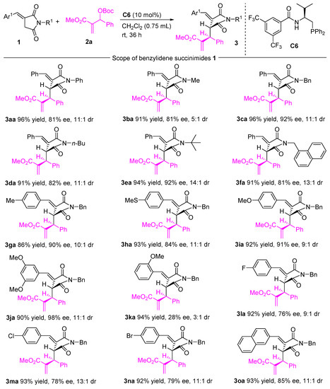 We started our investigation with the model reaction between 3-benzylidene-1-phenylpyrrolidine-2,5-dione 1a and MBH carbonate 2a in CH2Cl2 at room temperature for 16 h (Table 1). Initially, the reaction proceeded smoothly in the presence of phosphine C1 to furnish the desired succinimide 3aa at a 76% yield with 29% ee and 10:1 dr (Table 1, entry 1). To improve the efficiency and stereoselectivity, the chiral nucleophilic phosphine catalyst was carefully screened (Table 1, entries 2–8). Pleasingly, the C3-catalyzed reaction afforded the desired product 3aa at an 85% yield with 56% ee and 10:1 dr (Table 1, entry 3). The use of C4 as a catalyst enabled the formation of product 3aa at a 91% yield with 62% ee and 8:1 dr (Table 1, entry 4). Particularly, the desired product 3aa was obtained at a 95% yield with 85% ee and 11:1 dr when phosphine C6 was employed (Table 1, entry 6). Further modifying the catalyst structure did not enhance the efficiency or the asymmetric induction (Table 1, entries 7 and 8). The effect of the substituent on the nitrogen atom of α-alkylidene succinimides was also surveyed. The C6-catalyzed reaction of 3-benzylidene-1-methylpyrrolidine-2,5-dione 1b furnished the corresponding product 3ba at a 94% yield with 77% ee and 9:1 dr (Table 1, entry 9). Notably, product 3ca was obtained at a 90% yield with 92% ee and 10:1 dr from the C6-catalyzed reaction of 1-benzyl-3-benzylidenepyrrolidine-2,5-dione 1c (Table 1, entry 10). With these encouraging data in hand, we then further optimized reaction conditions to obtain better results. The screening of reaction media disclosed that CH2Cl2 was suitable (Table 1, entries 11–14). The concentration was found to have a large effect on the reaction (Table 1, entries 15–18), enabling the formation of product 3ca at a 92% yield with 92% ee and 11:1 dr (Table 1, entry 17). Neither increasing nor lowing the temperature could achieve better results (Table 1, entries 19–20). Prolonging reaction time to 36 h, the yield was increased to 96% without compromising stereoselectivity (Table 1, entry 21). However, further prolonging reaction time decreased the enantioselectivity (Table 1, entry 22). As a result, we identified the optimal reaction conditions: when 1-benzyl-3-benzylidenepyrrolidine-2,5-dione 1c (0.05 mmol) was treated with MBH carbonate 2a (0.06 mmol) in the presence of catalyst C6 (10 mol%) in CH2Cl2 (0.75 mL) at room temperature for 36 h, the desired succinimide 3ca was obtained at a 96% yield with 92% ee and 11:1 dr.
