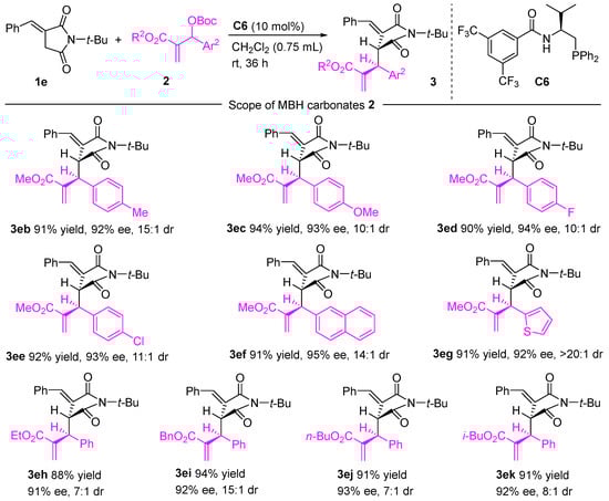 Subsequently, the scope of MBH carbonates was also investigated with the C6-catalyzed reaction of α-benzylidene succinimide 1e (Scheme 3). To our delight, various MBH carbonates 2b–f with different substituents (Ar2) were found to be compatible under standard conditions to afford the corresponding succinimides 3eb–ef at a 90–94% yield with 92–95% ee and 10:1–15:1 dr. No significant electronic effect on the aromatic moiety was observed. Particularly, the MBH carbonate bearing thiophen-2-yl group 2g reacted smoothly with α-benzylidene succinimide 1e to afford the desired product 3eg at a 91% yield with 92% ee and >20:1 dr. Moreover, the ester groups of MBH carbonate 2 had a slight effect on the efficiency and stereoselectivity, furnishing products 3eh–ek at an 88–94% yield with 91–93% ee and 7:1–15:1 dr. Taken together, these encouraging results indicated that the chiral phosphine-catalyzed allylic alkylation of α-benzylidene succinimides with MBH carbonates was achieved, furnishing succinimide derivatives bearing contiguous chiral tertiary carbon centers at high yields with asymmetric induction.