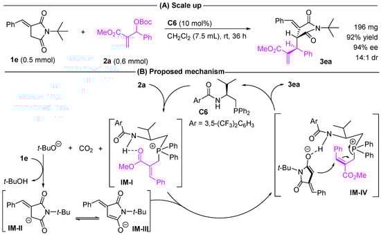 To demonstrate the synthetic potential, the C6-catalyzed reaction was scaled up to 0.5 mmol of the starting material under standard reaction conditions. The corresponding product 3ea was obtained at a 92% yield with 94% ee and 14:1 dr (Scheme 4A). The absolute configuration of 3la was unambiguously confirmed by X-ray crystallography (CCDC 2244711 (3la) contains the supplementary crystallographic data for this paper. These data can be obtained free of charge from The Cambridge Crystallographic Data Centre via www.ccdc.cam.ac.uk/data_request/cif. For details concerning the crystal structure of 3la see the Supplementary Materials as well). The stereochemistry of other products was assumed by analogy. On the basis of the reported results and our previous work [33], a proposed reaction mechanism was shown in Scheme 4B. The nucleophilic attack of organocatalyst C6 to MBH carbonate 2a formed the intermediate IM-I and released the basic t-BuO− ion to deprotonate α-benzylidene succinimide 1e to afford the intermediate IM-II. The intermediate IM-II could isomerize into the intermediate IM-III. Via IM–IV, the reaction of intermediate IM-I with intermediate IM-III led to the formation of the desired product 3ea and regenerated the catalyst C6.