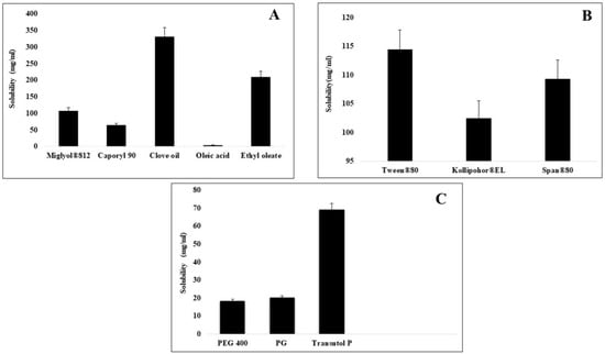 Comparative solubility of cefixime in various oils (A), surfactants (B), and co-surfactants (C) evaluated at 25 °C.
