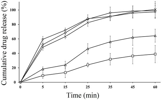 In vitro dissolution study of pure CFX P1 (□), marketed CFX suspension F5 (∆) CFX from oily droplets F2 (○), F3 (×) and F4 (◊) in SGF (0.1 N HCL, pH 1.2) at 37 °C for 60 min. Data are presented as means (n = 3) ± SD.