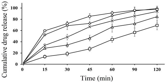 In vitro dissolution study of pure CFX P1 (□), marketed CFX suspension F5 (∆) CFX from oily droplets F2 (○), F3 (×) and F4 (◊) in SIF (PBS, pH 6.8) at 37 °C for 120 min. Data are presented as means (n = 3) ± SD.