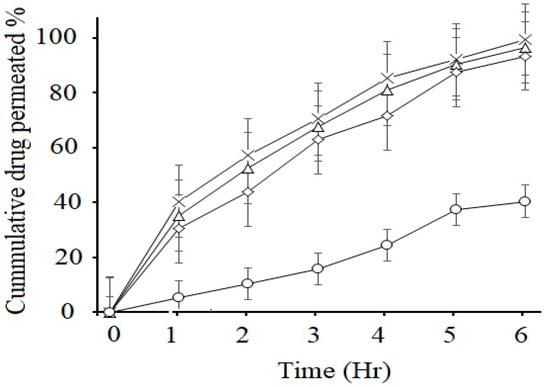 Ex vivo permeation studies of marketed CFX suspension F5 (○) and CFX from oily droplets F2 (×), F3 (∆) and F4 (◊) in PBS pH 6.8 at 37 °C. Data are presented as means (n = 3) ± SD.