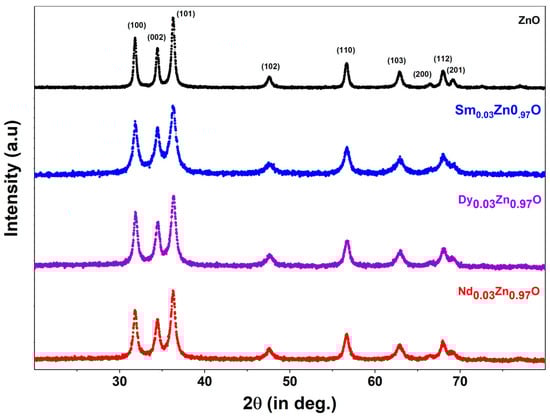 Figure 1 demonstrates the X-ray diffraction pattern for all synthesized samples. ZnO and doped nanoparticles exhibit a pure phased hexagonal structure with indexed peaks of (100), (002), (101), (102), (110), (103), (200), (112), and (201). There is no impurity peak present in all of the prepared samples. The indexed peaks match the JCPDS card number 36-1451. There are no additional peaks related to dopants or impurities, showing that the samples are very pure and of a crystalline nature. Because of the inclusion of rare earth-metals in ZnO, the XRD patterns of all rare earth-doped ZnO indicated a trend towards lower theta values compared to pure ZnO nanoparticles. The enlargement of the unit cell caused by the mismatch in ionic radii of Zn ions and rare earth ions may be the source of the diffraction peak’s shift towards a lower theta value. Additionally, the slight shift is an indication that rare earth ions have been incorporated into the ZnO matrix. In the literature, similar findings are observed where metals create analogous alterations in the crystal structure [29]. The crystallite size of all nanoparticles was calculated using the well-known Scherrer’s equation, which is given by: