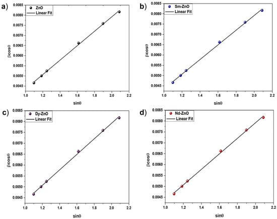 W-H plot for (a) ZnO nanoparticles, (b) Sm-doped ZnO nanoparticles, (c) Dy-doped ZnO nanoparticles, (d) Nd-doped ZnO nanoparticles.