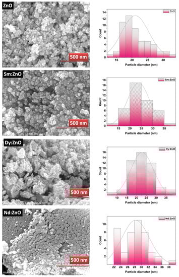 The surface morphology of the catalysts was analysed with the help of SEM images. Figure 3 shows the SEM images for pure ZnO and REdoped ZnO nanoparticles recorded at the 500 nm scale. It is clear from the images that grains in all samples lie in the nanometer range. The surface of all samples contains almost spherical, rough grains. The surface of pure ZnO appears to have fluffier grains, while the surface of samples doped with rare earth elements looks quite dense. The Nd-doped ZnO nanoparticles appear to have a denser structure than other catalysts. The grains distribution was studied by analyzing the histogram prepared using ImageJ software. For pure ZnO nanoparticles, the grains were found to be in the 10–35 nm range. However, for Sm doped ZnO nanoparticles, grain size distribution ranges between 10–40 nm, with an average grain size of 23 nm. The Dy doped samples consist of grains spreading over a wide range of 5–40 nm, with an average grain size of 22.5 nm. However, for Nd doped ZnO nanoparticles, grains were found to be in the narrow range of 22–40 nm, with an average grain size of 28 nm. The observed grains size for all samples differs slightly from the crystallite size obtained from XRD due to the smaller dimension and agglomerated nature of the samples. The presence and distribution of elements on the surface of the synthesized samples were investigated using energy-dispersive X-ray (EDX) spectroscopy. Figure 4a–d shows the EDX pattern for all synthesized samples. The EDX spectrum revealed the presence of all desired elements in all samples. Furthermore, a TEM image for Dy doped ZnO nanoparticles was recorded (Figure 5a). It is visible from the micrograph that the sample consists of particles smaller than 100 nm. The particle size distribution graph revealed an average particle size of 40 nm for Dy doped ZnO nanoparticles (Figure 5b). The SAED pattern (Figure 5c) consists of bright, regular spots, indicating the good crystalline nature of the sample. The observed results are in good agreement with the XRD results.