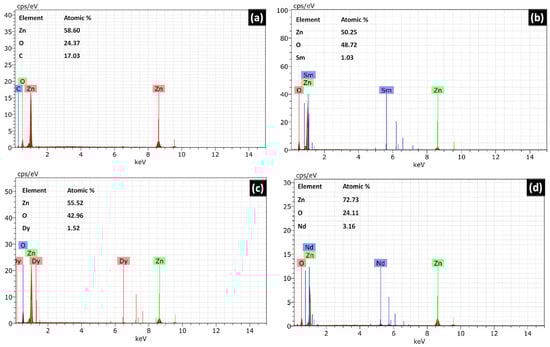(a–d) Energy dispersive X-ray spectrum for undoped ZnO, Sm doped ZnO, Dy doped ZnO, and Nd doped ZnO nanoparticles.