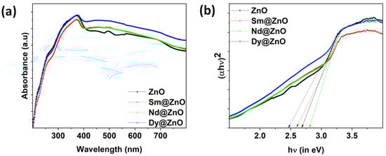A UV-vis analysis was employed to investigate the effect of doping ions on ZnO NPs. Figure 6a demonstrates the UV–visible spectra of ZnO, 3% Sm-ZnO, 3% Nd-ZnO, and 3% Dy-ZnO nanoparticles. The absorption edges lie at 382 nm in pure ZnO, mainly because of the electronic transition from the valence band to the conduction band of ZnO nanoparticles [32,33]. It is visible from the absorbance spectra that all samples are capable of absorbing in the visible light region. The rare earth ion doping causes a shift in the absorption edge. As per the literature, the shift in the absorption edge can be related to the charge transfer transition between the f-block electrons of rare earth metal ions and the VB or CB of ZnO nanoparticles [34]. Plotting the Tauc’s curve from absorbance data allows for the precise analysis of band gap variation. The band gap energy value of ZnO and rare earth doped ZnO nanoparticles was calculated using Tauc’s equation given by: ref. [35].