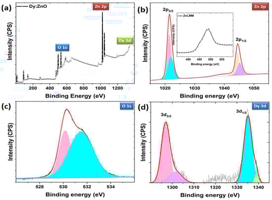 To determine the elemental composition of the prepared nanoparticles, the X-ray photoelectron spectra were recorded. The valence state information is analyzed by taking the core level spectra of Zn2p, O1s, and Dy3d. Figure 7a shows the survey scan spectrum for Dy-doped ZnO nanoparticles, confirming the presence of Zn, O, and Dy elements in the sample. The Zn2p spectra contain two major doublets (2p3/2, 2p1/2), which are further fitted with two major and two minor peaks (Figure 7b). The peaks are located at 1021.41, 1021.94, 1044.40, and 1045.19 eV, respectively. The peaks revealed that Zn ions have a 2+ valence state [40]. No Zn clusters were supported through XPS peaks. The sharpness of the doublet indicates the presence of Zn2+ ions in the sample [41]. Two minor peaks correspond to the different environments of Zn ions, indicating Zn interstitials or any defects present. The Zn interstitials can be confirmed through Zn LMM spectra for auger electrons. The Zn LMM auger peak (at 498 eV) from the spectra (as shown inset) is attributed to Zn interstitials [42]. However, to confirm the presence of Zn vacancies in the sample, photoluminescence studies are shown in a later section. The O1s XPS spectrum appeared as an asymmetric curve, which indicates the presence of different oxygen environments in the sample (Figure 7c). The O 1s spectrum is de-convoluted into two peaks at 530.16 and 531.5 eV, respectively. The low binding energy peak is the characteristic peak belonging to Zn-O bonding [43], and the higher binding energy peak is an indication of loosely bound oxygen or adsorbed oxygen on the surface of the sample [44]. The Dy core level spectra consists of two major peaks at 1296.98 and 1335.36 eV, which confirms the Dy ions in the 3+ state in the sample (Figure 7d) [25,45]. Overall, the XPS results confirm the presence of OH groups on the surface of the catalyst and the valence states of 2+ and 3+ for Zn and Dy ions.