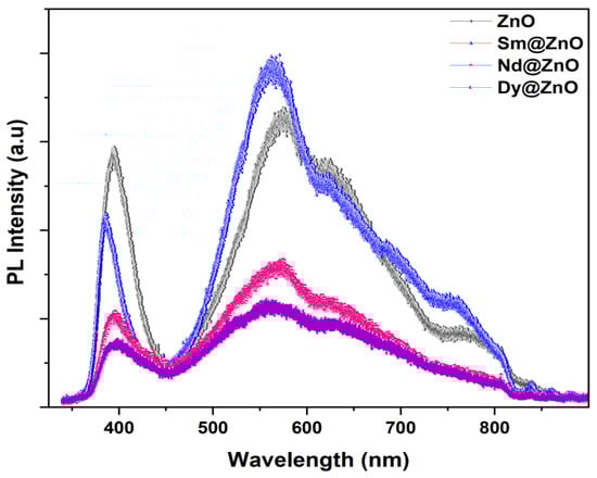 The reason for the variation in the photocatalytic performance of the catalysts can be understood by analyzing the photoluminescence emission spectra of all samples. Figure 8 represents the PL spectra for pure ZnO and doped samples. The charge separation efficiency of the carriers is verified by analyzing the PL emission efficiency in the observed spectra. At an excitation wavelength of 320 nm, the emission spectra of pure ZnO nanoparticles and rare earth doped nanoparticles were recorded at room temperature. The lower PL intensity symbolizes a lower charge recombination rate, while the higher PL intensity shows a higher charge recombination rate of the charge carriers. In the UV region, pure ZnO exhibits the highest PL intensity, followed by the Sm, Nd and Dy doped ZnO samples. However, in the visible region, PL intensity follows the trend of Sm:ZnO > ZnO > Nd:ZnO > Dy:ZnO. The results indicate that the lowest electron-hole recombination is favoured for Dy doped ZnO nanoparticles as compared to other photocatalysts, thereby altering their photocatalytic performance in the degradation of pollutants [46].