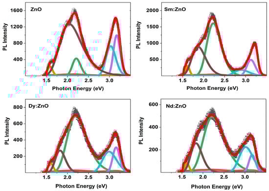where α corresponds to the absorption coefficient, hν is known as photon energy, A indicates the band tailing parameter, and Eg denotes the optical band gap. Figure 6b depicts the Tauc’s plot as plotted using Equation (1). The band gap for ZnO, Sm doped, Nd doped, and Dy doped samples were found to be 2.68 eV, 2.59 eV, 2.80 eV, and 2.47 eV, respectively. However, the apparent low band gap can be attributed to the presence of excess Zn, or Zn interstitials in the wurtzite structure of ZnO. In a recent report, band gap values were found to vary from 3.185 to 2.892 eV for un-doped ZnO and 5% Co doped ZnO nanoparticles [36]. Similar results have been reported by P. Pascariu et al. for rare earth doped ZnO nanostructures in which the band gap was 2.80, 2.81 eV, 2.82 eV, and 2.85 eV for un-doped ZnO, Sm, Er and La doped ZnO, respectively [37]. There are claims that even the co-doping (Fe+Al) may lead to a decrease in the band gap of ZnO nanoparticles synthesized through the co-precipitation method, and may improve the optoelectronic properties of ZnO nanoparticles [38]. The band gap energy of a semiconductor material is generally determined by the crystal imperfection caused by the dopant type and amount, as well as other factors. Crystallite size is one of the common factors which generally affects the band gap values; however, in our experimental findings, this does not appear to be the prime factor. The second factor that may have altered the band gap is the presence of some structural defects which are different for un-doped and doped ZnO nanoparticles [39]. The results indicate that rare earth ions are capable of showing a wide absorbance spectrum in sunlight, which can favor the photocatalytic performance of the catalysts.