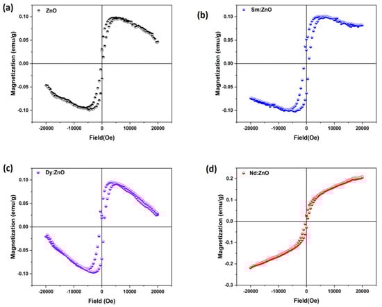 The magnetization versus applied magnetic field curves recorded at room temperature for all samples are shown in Figure 10(a–d). M-H loops of bare ZnO nanoparticles (Figure 10a), as well as Sm and Dy doped ZnO nanoparticles (Figure 10b,c), are divided into two types of regions. One is for low fields around the origin of the curves, showing the magnetic nature of the samples, and the other is for high field values, confirming the diamagnetic contribution in the samples as well.
