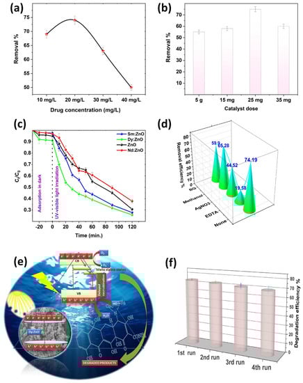 In the experiment, the TC concentration and catalyst dosage were optimized by performing the degradation experiments for varied TC concentrations (10, 20, 30, 40 mg/L) and catalyst (Dy doped ZnO) dosages (5, 15, 25, 35 mg). The observed results are shown in Figure 11a,b. The initial concentration of organic matter is a crucial factor to take into account when investigating photocatalytic reactions, since it directly influences the rate and level of degradation of the entire catalytic reaction. When the catalyst dose was 25 mg, the maximum TC degradation was observed at 20 mg/L TC concentration. Therefore, 20 mg/L TC concentration was considered as the optimum concentration for a photocatalytic degradation experiment. In addition, the dosage of the catalyst is also as crucial factor for the photocatalytic reactions, and the amount of catalyst was optimized at a TC concentration of 20 mg/L, as shown in Figure 11b. The chart clearly shows that the 25 mg of catalyst has the maximum degrading efficiency. The degradation rate reduces when the amount of catalyst becomes too high, which might be owing to the fact that an optimal amount of catalyst can increase the number of reactants and catalyst particles, resulting in enhanced catalytic efficiency. When the catalyst concentration is too high, the presence of surplus particles causes light dispersion and blocking of the light route, resulting in a lower chance of the surface of the catalyst particles receiving uv-visible light and, as a result, a drop in reaction efficiency. Finally, the photocatalytic degradation performance is optimum, with an initial TC concentration of 20 mg/L and a catalyst dose of 25 mg.