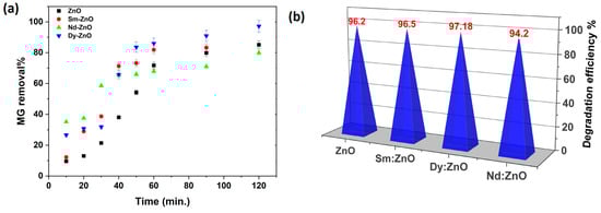 To evaluate the effectiveness of the produced catalysts, we performed a photocatalytic test on the organic dyes Malachite green (MG) and Crystal violet (CV) under UV-visible light irradiation. The produced materials’ photocatalytic performance was examined by measuring the change in MG concentration as a function of irradiation time in the presence of various catalysts. Dy-doped ZnO was shown to have better photo catalytic activity than the other doped catalysts and pure ZnO for this dye, as shown in Figure 13a. The maximum degradation efficiency of 97.13% was achieved for the Dy doped ZnO photo catalyst, followed by the Sm doped catalyst (96%), ZnO (84%), and the Nd doped catalyst (79%). Another set of experiments was performed for the degradation of crystal violet dye (CV). The results are in accordance with the trend obtained for MG and TC degradation. However, the maximum degradation efficiency in this case was 96.18% for the Dy doped ZnO catalyst. All synthesized catalysts were found to exhibit excellent degradation efficiency (>94%) against CV dye (Figure 13b). The results shows that rare earth doped ZnO nano photocatalysts are very promising for the photodegradation of drugs and dyes. Furthermore, the organic pollutant degradation efficiency of the produced photocatalyst was compared to the prior results, which are shown in Table 3.
