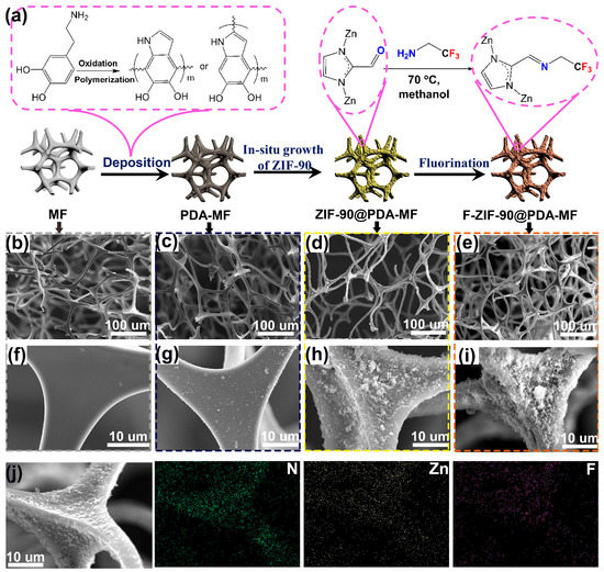 (a) Schematic illustration for the fabrication process of F-Zeolitic imidazolate frameworks -90/polydopamine-melamine formaldehyde (F-ZIF-90@PDA-MF). Scanning electron microscope (SEM) images for (b,f) pristine MF, (c,g) MF-PDA (d,h) ZIF-90@PDA-MF and (e,i) F-ZIF-90@PDA-MF. (j) Element mapping images of F-ZIF-90@PDA-MF.