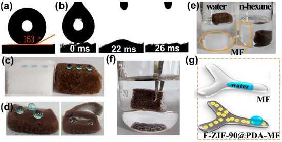 Several simple experiments also provide evidence for a noticeable transformation in surface wettability. As displayed in Figure 4c, the raw MF sponge quickly absorbed water droplets that landed on its surface. In contrast, water droplets showed a spherical shape on the composite sponge surface, demonstrating its high hydrophobicity. In addition, spherical water droplets on the superhydrophobic composite sponge could be entirely removed using filter paper (Figure S3). Water droplets exhibit highly spherical shapes on the cross-section and external surface of the composite sponge (Figure 4d), thereby confirming a thorough hydrophobic modification of the bulk sponge. A big difference emerged after the original MF and composite sponge were put in n-hexane and water (Figure 4e). The MF sponge quickly sank to the bottom in both n-hexane and water. However, the F-ZIF-90@PDA-MF floated on the water surface but sank to the bottom in n-hexane. These observations agree with the results of the contact angle tests. In addition, when an external force was used to immerse the composite sponge in water, there were plenty of trapped air bubbles around the sponge surface (Figure 4f). A similar phenomenon has also been widely reported in the literature [50,51]. The changes in the wetting property for superhydrophilic MF and superhydrophobic F-ZIF-90@PDA-MF are schematically illustrated in Figure 4g. It can be explained that the grafted low surface energy of the CF3 groups significantly decreases the surface energy and that the ZIF-90 nanocrystals improve the surface roughness [40,45,46]. The hydrophobic performance of solid materials is widely accepted to be dependent on low surface energy and high surface roughness. The synergistic effect of low surface energy and high surface roughness leads to a huge transformation of wetting properties from superhydrophilic to superhydrophobic. Moreover, the stability of the superhydrophobic composite sponge was evaluated under different conditions, including physical squeezing (20 compression-release cycles), low/high temperature (−18 °C and 150 °C for 1 h), and seawater for 1 h. As shown in Figure S4, water drops in spherical shapes occurred on all surfaces after the treatment of superhydrophobic F-ZIF-90@PDA-MF under different conditions. The stability test results suggest that the superhydrophobic F-ZIF-90@PDA-MF can maintain its highly hydrophobic property under different harsh conditions, thus demonstrating its structural stability.