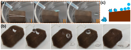It has been demonstrated in previous studies that many superhydrophobic materials have self-cleaning properties [32,41]. Generally, water droplets rolling across the superhydrophobic surface remove impurities that adhere to the material surface. The self-cleaning effect is essential for preventing the contamination of the substrate’s surface in applications. A water drop rolling test was conducted to examine the possibility of self-cleaning on a superhydrophobic F-ZIF-90@PDA-MF composite [60]. As seen in Figure 5a, a series of video shots of a rolling water droplet on the tilted surface (angle < 10°) of the F-ZIF-90@PDA-MF sponge demonstrate that water droplets readily roll away from the tilted F-ZIF-90@PDA-MF sponge. The self-cleaning ability of the superhydrophobic composite sponge was examined by the self-cleaning performance test. White zinc oxide particles were sprinkled on the surface of the composite sponge as grain contaminants [32]. It is clear that due to the rolling of water droplets, the contaminants were taken away from the composite sponge, leaving a relatively clean surface (Figure 5b). Figure 5c schematically depicts the self-cleaning process. It is noted that the small amounts of contaminants that penetrated the composite sponge remained after the end of the self-cleaning test because they could not be contacted by rolling water droplets. Nevertheless, the superhydrophobic composite sponge exhibits promising potential for self-cleaning.