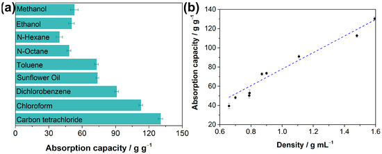 These above results reveal the superhydrophobic and superoleophilic properties of the as-prepared F-ZIF-90@PDA-MF. Oil absorption capacity is generally regarded as one of the more important indexes for absorbent materials to achieve in terms of oil spill recovery [59,61]. Oil adsorption tests were conducted to determine oil absorption capacities of the composite sponge. The adsorption capacity of the as-prepared composite sponge ranged from 39.4 to 130.4 times its weight (Figure 6a), demonstrating that the composite sponge has high absorption capacities for various organic liquids. The oil absorption capacity of the F-ZIF-90@PDA-MF sponge shows relatively good recycling performance and stability. For example, about 88% of its original absorption capacity remains for n-octane even after 20 cycles (Figure S5). In addition, the mass-based absorption capacities were correlated with the liquid density of organic compounds, as plotted in Figure 6b. It was seen that the mass-based absorption capacity of the F-ZIF-90@PDA-MF sponge rose as the liquid density of organic compounds increased. The previous literature reports a similar phenomenon [31,62]. It can be explained that the micron-sized pores of the sponge substrate mainly provide the pore volume for solvent storage [62]. Additionally, as seen in Table 1, the F-ZIF-90@PDA-MF composite sponge achieves comparable or superior water contact angles and absorption capacities of organic compounds with respect to those of various MOF/sponge composite materials.