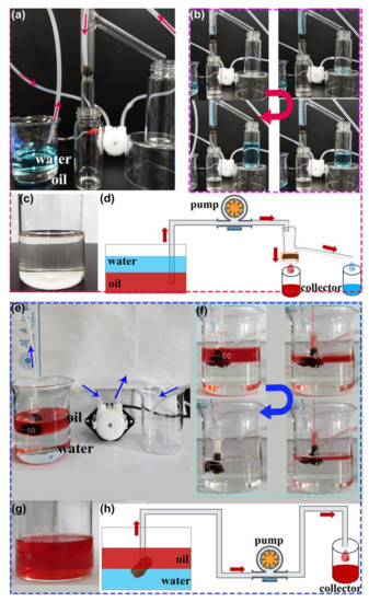 The majority of the reported hydrophobic sponge-based adsorbents have a high oil absorption capacity of tens of their weight [7]. In order to use adsorbent materials for the subsequent cycle, the absorbed oil needs to be promptly removed from the absorbent when the absorbent is saturated [7,65]. Based on this analysis, as shown in Figure 8e, another separation device for continuous oil−water separation was tested. The composite sponge, as an absorbent, was fixed in the tube and connected with an external self-priming pump. When the superhydrophobic and superoleophilic composite sponge was brought into contact with the oil/water interface, the oil molecules easily permeated into the free space in the composite sponge and were then locked in the sponge. In contrast, the water molecules were strongly repelled. Once the absorbed oil in the sponge was transported into the collector via the tube as soon as the pump was turned on, the freed-up pore space could further absorb the additional floating oil. As a result, the continuous collection of oil was achieved. Figure 8f shows the continuous separation process of the light oil−water mixture. The removal and collection of oils from the water was successfully accomplished by F-ZIF-90@PDA-MF with the aid of a pump. Furthermore, as shown in Figure 8c,g, no water droplets in the collected oil were visible to the naked eye, thereby indicating a highly selective separation. A schematic illustration of the two aforementioned separation models is presented in Figure 8d,h. In brief, these experimental results demonstrate efficient continuous separation of oil and water.