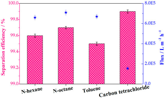 The separation efficiency and flux of various immiscible oil−water mixtures in the continuous separation process. The pink columns and blue stars represent the separation efficiency and flux, respectively.