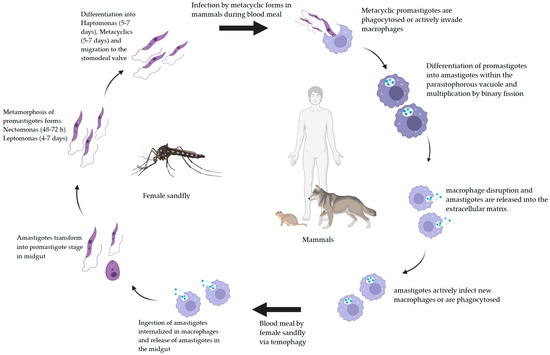 Leishmaniasis is a public health problem with increasing incidence in the last decade and is considered the second-highest cause of death among infectious tropical diseases [1]. Leishmania infantum is a diploid organism, with no distinct sexual cycle [2]. It, like other species of the genus, has a very complex digenetic life cycle involving definitive (vertebrates) and intermediate hosts (insect vectors) with two basic development stages: (1) promastigote, the proliferative form found within the digestive tracts of infected female sandflies; and (2) amastigote, the proliferative form found in many types of mammalian cells [3,4], mainly macrophages, which are the host’s first line of defense (Figure 1) [5]. As a member of the Leishmania subgenus, L. infantum is considered a suprapilar parasite, with its development restricted to the midgut of sandflies [6,7].