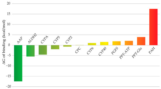 Compound 32 was docked into the proteins listed in Table 3, as described in the Methods section. For PPT, the ATP (PPT-ATP) and glucose (PPT-Glu) binding sites were explored separately. In the case of HDAC, Gold could not find any valid binding mode. This resulted in a total of 22 ligand–receptor complexes selected for further analyses. The detailed results of the molecular docking calculations are provided as Supporting Information in Table S1 and the top-scored conformer per target is presented in Table 4. Overall, the best docking scores were obtained for CYP2, the ATP binding site of PPT, and PAH. On the other hand, the worst scores were predicted for CPC, CYP40, and CYPA.