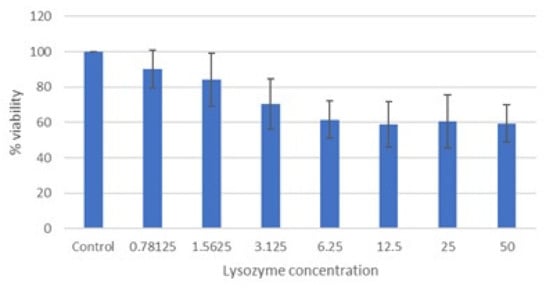 Cytotoxicity of lysozyme HCl (mg/mL) after 72 h of incubation (MTT assay). Cell viability expressed as the percentage of control (untreated) cell viability. Data are expressed as the means ± SD of three independent experiments performed in duplicate.