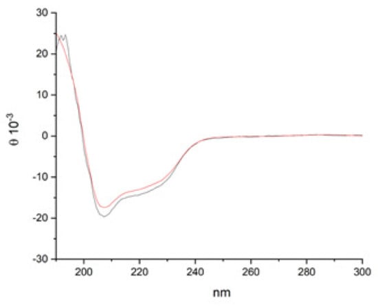 CD spectra of lysozyme HCl (black line) and heat-treated lysozyme HCl (red line) in water (0.25 mg/mL).