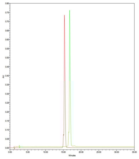 Representative HPLC chromatograms of native lysozyme HCl (red line) and heat-treated lysozyme HCl (green line), analyzed with the above reported analytical method, are reported in Figure 5. These HPLC analyses are practically superimposable, and no evidence of new degradation products are present on heat-treated lysozyme HCl.