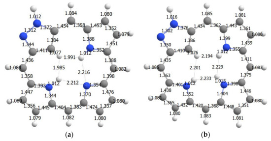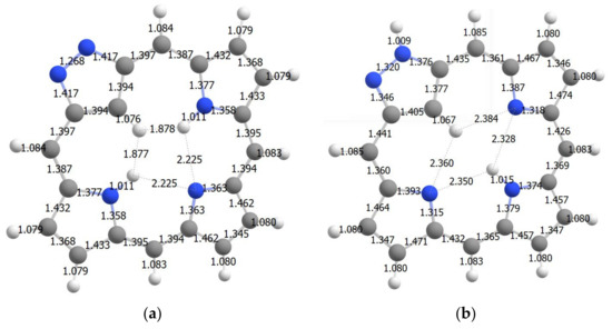 Calculated bond lengths and interatomic distances for the core atoms for pyrazoloporphyrin monocation PzP-2,22,24-H+ (a) and dication [PzP-2,22,23,24-H]2+ (b).