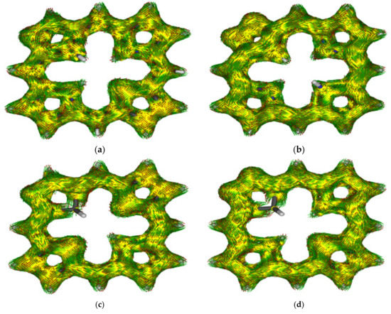 AICD plots (isovalues 0.05) for PzP-2,22,24-H+ (a), PzP-22,23,24-H+ (b), PzP-2,21,23-H+ (c), and PzP-21,22,24-H+ (d).