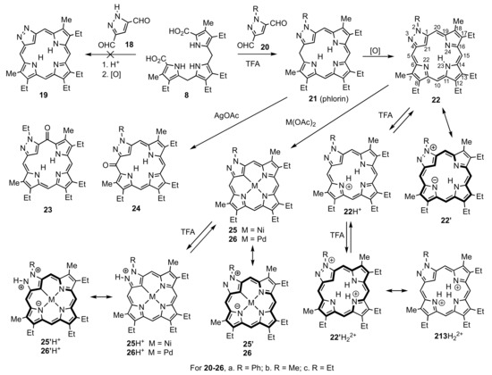 - Young, A.M.; Von Ruden, A.L.; Lash, T.D. Pyrazole Analogues of the Porphyrins and Oxophlorins. Org. Biomol. Chem. 2011, 9, 6293–6305. [Google Scholar] [CrossRef]