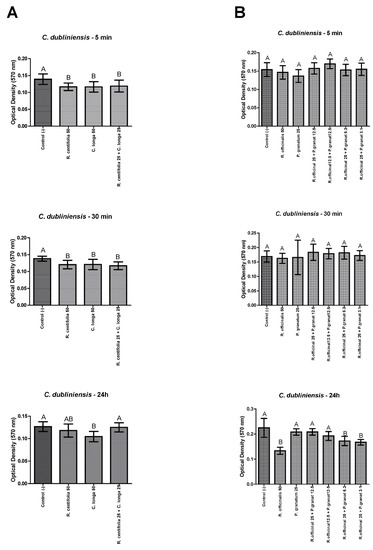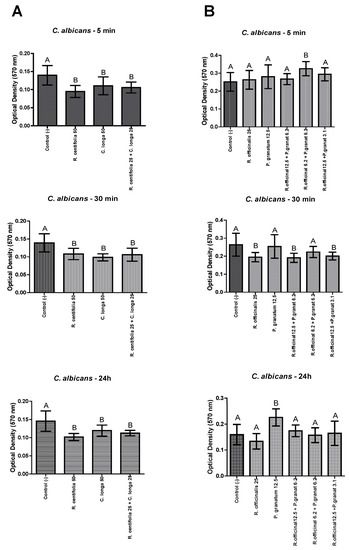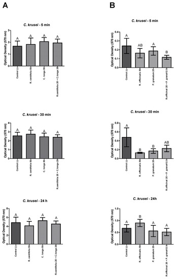 R centifolia and C. longa glycolic extracts, and their combination, were not effective against C. krusei biofilms (p > 0.05) (Figure 4A). Conversely, R. officinalis and P. granatum glycolic extracts, and their combination, were effective against C. krusei biofilms after 30 min, being all statistically equal (p ≤ 0.05) (Figure 4B).
