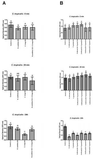 Rcentifolia and C. longa glycolic extracts, and their combination, were effective against C. tropicalis biofilms after 24 h, however, after 30 min only their combination, and after 5 min only the R. centifolia glycolic extract were effective, with a statistically significant difference with the control group (p ≤ 0.05) (Figure 3A). Besides, R. officinalis and P. granatum glycolic extracts, and all their combinations, were effective against C. tropicalis biofilms after 24 h, with a statistically significant difference with the control group (p ≤ 0.05) (Figure 3B).