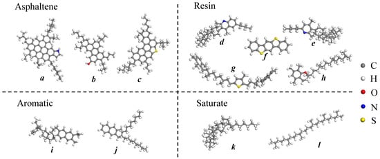 Representative molecules of the four components of neat asphalt binder: (a–c) asphaltene; (d–h) resin; (i,j) aromatic; (k,l) saturate.