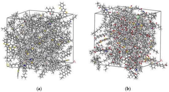 The molecules with specified numbers (see Table 1) were put into a cubic box with an initial density of 0.5 g/cm3 to construct the amorphous cell of neat and aged asphalt binder with periodic boundary conditions using MS7.0 software. Then, geometry optimization was performed on the model to bring it to the lowest energy. Subsequently, the dynamics simulation was carried out under the canonical (NVT) ensemble to reach the targeted temperature and then under the isothermal–isobaric (NPT) ensemble at 1 standard atmosphere pressure for 100 ps to approach the real density of asphalt binder. Finally, a 100 ps dynamics simulation was performed again under the NVT ensemble to make the asphalt molecular model reach a state of greater equilibrium. The last frames of the neat and aged asphalt molecular models are depicted in Figure 3.